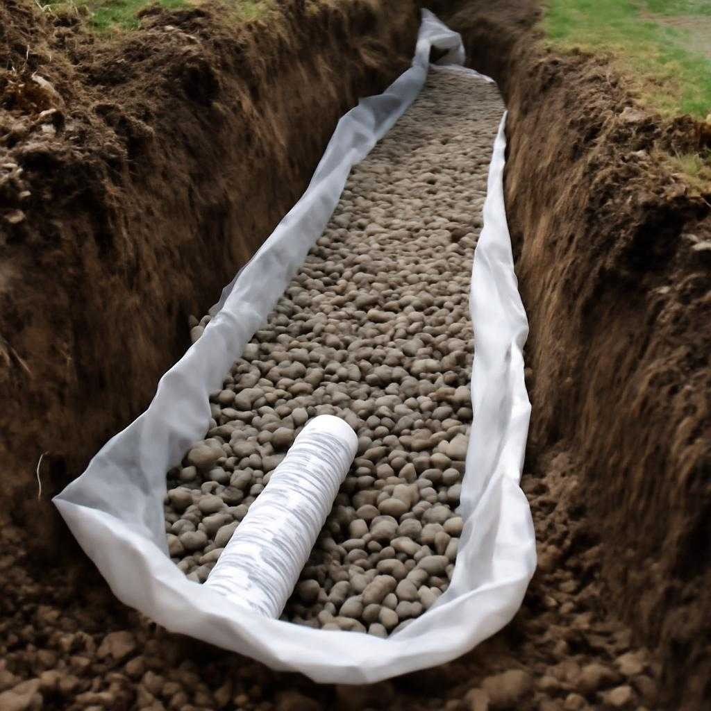Основание траншеи выравнивают с заданным уклоном. На дно укладывают геотекстиль, затем формируют слой щебня, размещают трубу, обсыпают ее щебнем и заворачивают материал с нахлестом. Геотекстиль работает как разделительный и фильтрующий слой. Он не дает грунту смешиваться со щебнем и уменьшает заиливание. На глине и суглинке качество обсыпки влияет на срок службы сильнее, чем толщина трубы.
