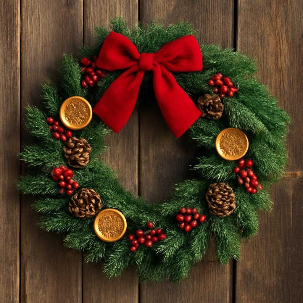 Базой служит габель — проволочный обруч, покрытый флористическим латексом. Диаметр 35–40 см создаёт баланс между мобильностью и визуальной щедростью. Хвою беру трёх пород: пихта, кипарис, голд крафт. Сухоцветы — лагурус, амарант, хлопок. Акценты — шарики из пуанса. Канитель маскирует узлы, придаёт отблеск. Аромакс — порошок с эфиром лемонграсса — заключаю в льняные капсулы.